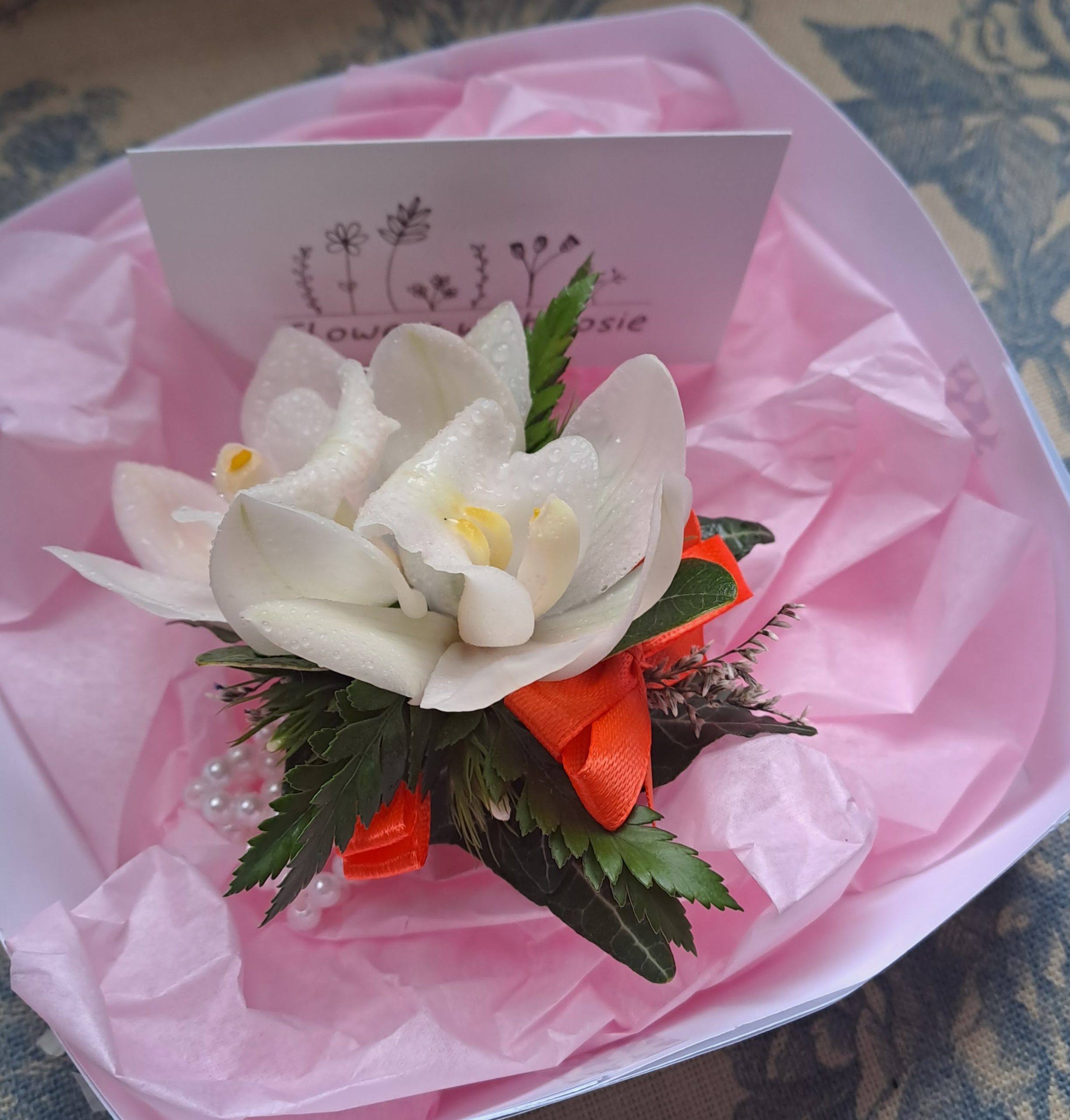 Sold out of pearl bracelets at this stage so the corsage will be on a ribbon to tie around the wrist.